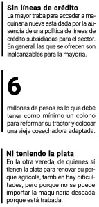 “No dan los números para que el colono pueda saltar a una máquina agrícola nueva. Para que un colono repare el motor de su cosechadora (las que predominan son tractores modelo ‘60, que poseen dos cilindros) deben contar con una inversión de $400 mil. Ni hablar si la máquina posee un motor más grande. Transformar la cosechadora a ponchada a una hidráulica sale 6 millones de pesos. Si el dinero para hacerlo debe salir de la ganancia de la producción, no se puede ni por casualidad”, apuntó Klingbeil.