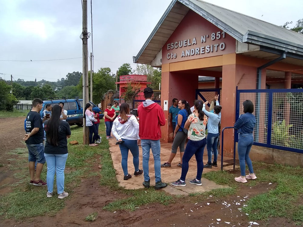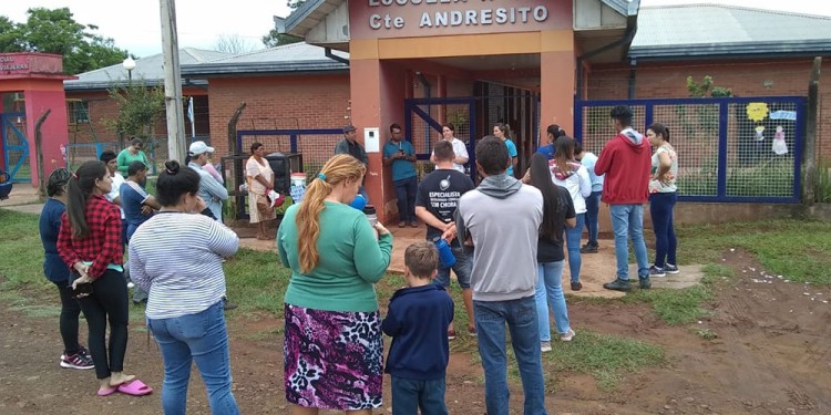 Padres de la Escuela 851 de Comandante Andresito se reunieron esta mañana frente a la institución donde se encuentran haciendo una sentada como medida de manifestación.