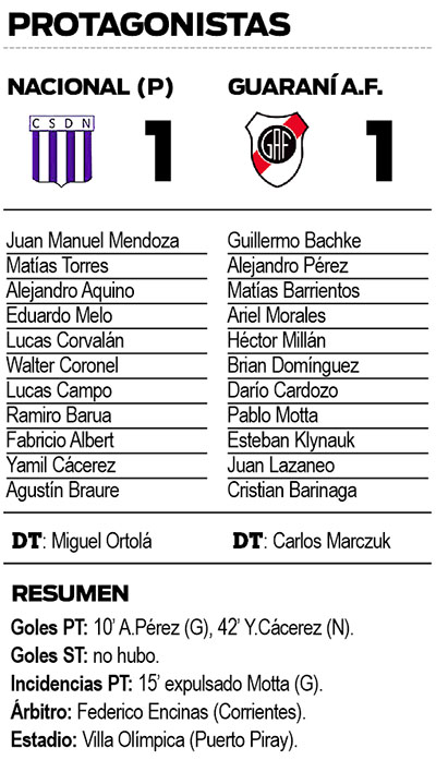 Todo parecía indicar que el 1-0 no se movería antes del entretiempo. Pero en el fútbol no hay nada escrito. Y Guaraní lo sufrió en carne propia, porque a los 42 Yamil Cácerez fusiló a quemarropas en el mano a mano a Guille Bachke y decretó el 1-1 para el local, después de un centro y un despeje a medias de Matías Barrientos, en pleno forcejeo con Agustín Braure.