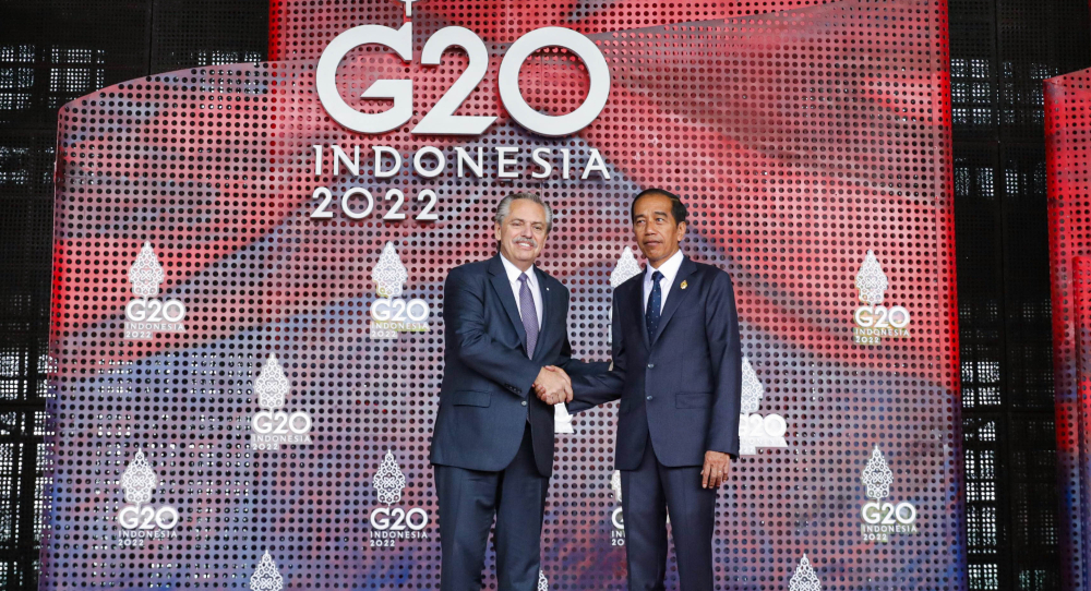 Lo curioso fue que el jefe de Estado ingresó al Hotel The Apurva Kempinski en Bali al que se trasladó en auto con el ministro de Economía, Sergio Massa, y el vicejefe de Gabinete, Juan Manuel Olmos, y saludó a su par de Indonesia, Joko Widodo, con quien llegó a fotografiarse en la previa del panel.