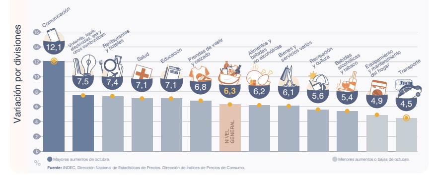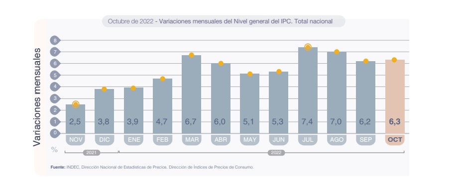El Índice de Precios al Consumidor (IPC) aumentó en octubre un 6,3% y de esta forma acumuló un alza de 76,6% en los diez primeros meses del año, según los datos hechos públicos este martes por el Instituto Nacional de Estadística y Censos (INDEC).