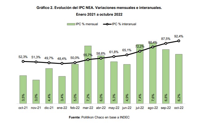 Al mismo tiempo, la inflación del 78,9% registrada en el período enero-octubre es “la más alta del país y el peor resultado (…) desde 2016″. Y también advierte la consultora que “el salto respecto a igual período de 2021 es de gran magnitud: +40 puntos porcentuales“.