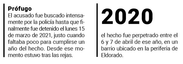 El proceso judicial tuvo lugar en el Tribunal Penal de Eldorado, y en la oportunidad el acusado, quien es mayor de edad, reconoció tanto la materialidad del hecho como su participación en el mismo, acordando la pena a cumplir a través de su defensa con la fiscalía.