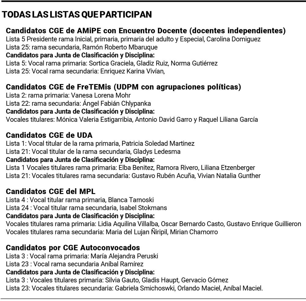 Con cinco listas definitivas por cada rama (primaria y secundaria), comienza la cuenta regresiva para celebrar las elecciones de vocales titulares para el Consejo General de Educación (CGE) y de vocales para la Junta de Disciplina y Clasificación (JCyD).