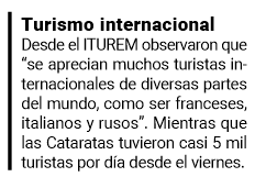 Además, observaron que “se aprecian muchos turistas internacionales de diversas partes del mundo, como franceses, italianos y rusos”. Mientras que las Cataratas tuvieron casi 5 mil turistas por día desde el viernes, sobre todo nacionales.