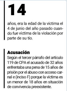 De acuerdo a la denuncia y a los relatos y evidencias plasmados en el expediente, la menor durante la noche del 4 de julio del año pasado fue ultrajada y forzada a callar bajo concretas advertencias de poner en riesgo la vida de su tía (pareja del victimario).