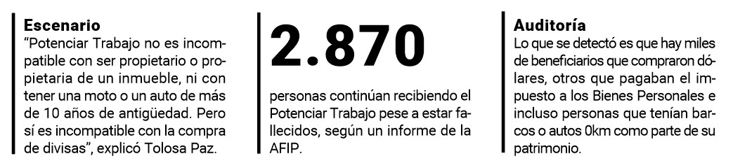 La ministra había señalado que solo el 0,3% de los beneficiarios presentó irregularidades como compra de dólar ahorro y/o realizaron gastos con tarjeta de crédito. Según detalló, hubo 145 personas que realizaron compras con tarjeta de crédito desde 100 dólares mensuales hasta 50.000 dólares acumulados durante los 26 meses analizados, totalizando consumos por 1.108.107. “No hay duda alguna de que es una condición para la baja inmediata de estos casos”, dijo. “A partir de este cruce de información, realizado sobre 1.362.579 titulares efectivos del programa, detectamos un 0,3% de casos que incumplieron las normas. Con esas personas, este Ministerio va a ser inflexible. Potenciar Trabajo no es incompatible con ser propietario o propietaria de un inmueble, ni con tener una moto o un auto de más de 10 años de antigüedad. Pero sí es incompatible con la compra de divisas”, había explicado.