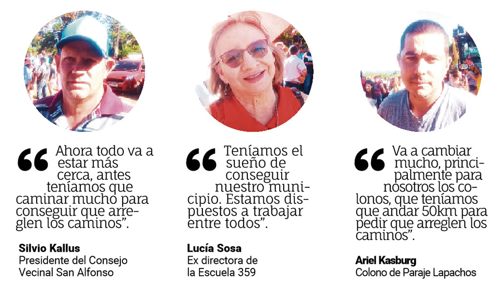 “Va a cambiar mucho para nosotros, principalmente para nosotros los colonos que muchas veces teníamos que ir una y otra vez al pueblo a buscar o a pedir que nos vengan a reparar los caminos, teníamos que hacer más de 50 kilómetros para hablar con un funcionario ahora lo vamos a tener acá cerca y vamos a tratar de empujar entre todos para que esto cambie para bien para nosotros y que Fracrán sea un municipio lindo, bueno, próspero y que mucha gente quiera venir a vivir acá”, dijo.
