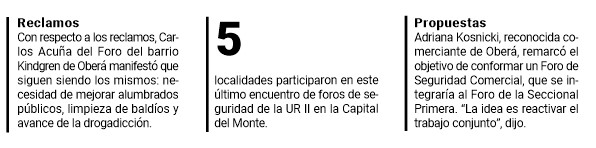 Por su parte, referentes del Foro de la Comisaría Seccional Segunda instaron a sumar más participantes de distintos barrios a los foros vecinales y remarcaron la necesidad de contar con sendas peatonales y alumbrado público en la ruta 5 hasta el barrio Las Palmas de Oberá.