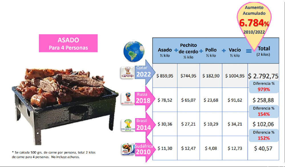 Quien quiera repetir el programa de juntarse a ver un partido del mundial y compartir un asado para cuatro personas este año deberá desembolsar unos $2.792. Es decir, 979% más que en Rusia 2018 y 6.784% más que en Sudáfrica 2010. Son 67 veces más caros.