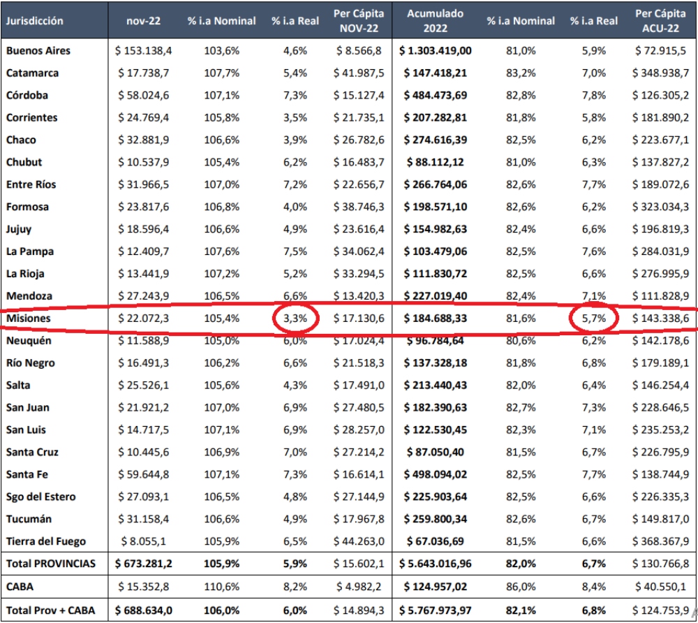 Tanto en noviembre, como en el acumulado de los primeros once meses, Misiones repite el crecimiento más bajo del país.A raíz de esto es que el Gobierno misionero viene reclamando una compensación por tener la coparticipación más baja, por recibir fondos en el puesto 18° y ser la 7ª provincia que más aporta a la recaudación nacional.