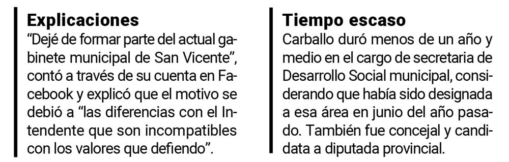 Un clima complejo atraviesa la Capital de la Madera debido a que Clelia Carballo presentó su renuncia indeclinable al cargo de secretaria de Desarrollo Social de San Vicente por “diferencias” con el intendente Fabián Rodríguez.