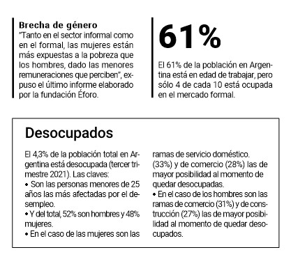 A su vez, las mujeres con niños y/o niñas a cargo “tienen mayor probabilidad de tener un empleo informal que hombres en la misma situación”.