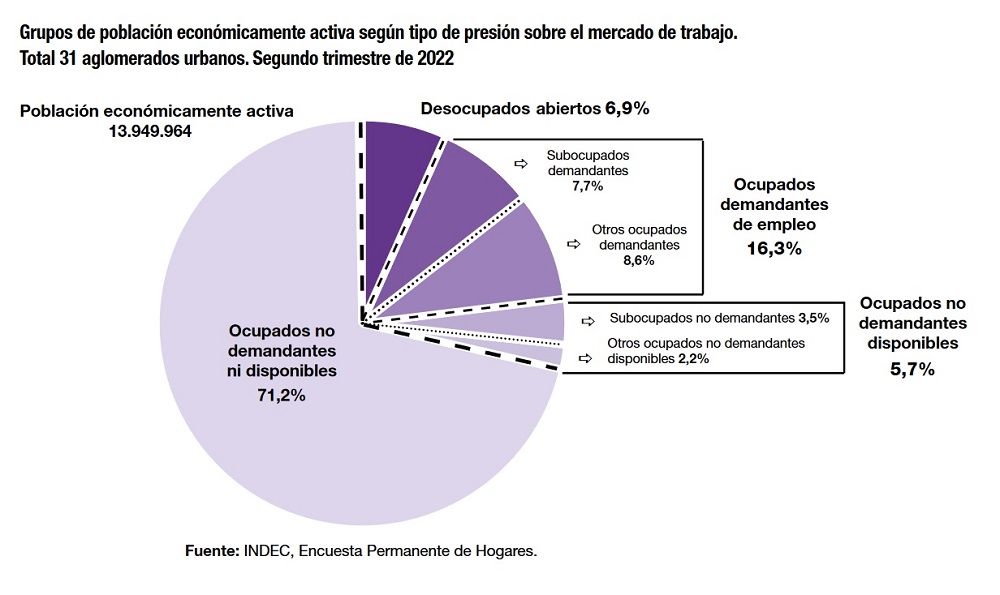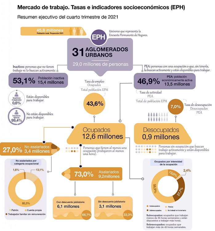 El dato, que se desprende de la Encuesta Permanente de Hogares (EPH) del tercer trimestre de 2021, fue utilizado por la fundación Éforo para realizar el último informe sobre población con empleo en el país y su respectiva caracterización.