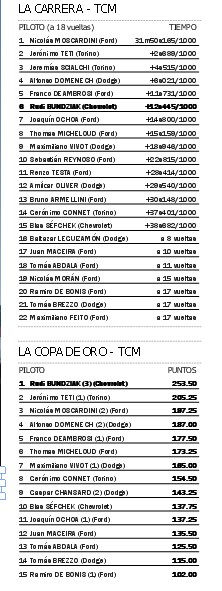 Siempre al mando del Chevrolet del Coiro Dole Racing, Rudito había arrancado el fin de semana con la pole position, resultado que le permitió sumar puntos clave y quedar a centímetros de la corona. Lo ya dicho, ayer fue quinto en la primera serie y le alcanzó para coronarse. Después, en la final, terminó sexto, a 12s445/1000 del último ganador del año, Nicolás Moscardini (Ford), quien fue tercero en el campeonato: el escolta de Rudi fue Jerónimo Teti (Torino).