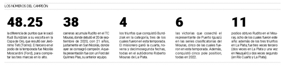 El automovilismo misionero tuvo ayer uno de sus días de mayor gloria. Y es que Rudito Bundziak logró dar el paso que le faltaba y se consagró campeón de la Copa de Oro del TC Mouras, en lo que fue el primer título de una categoría de la Asociación de Corredores de Turismo Carretera (ACTC) para la tierra colorada.