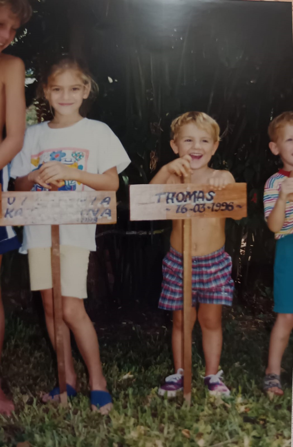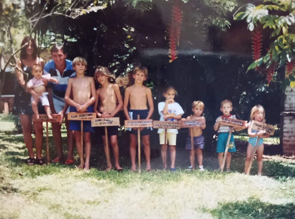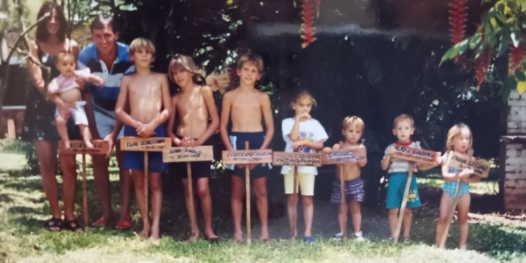 El 6 de enero de 1999, se reencontraron en Montecarlo, en la casa de la Oma Muschi y del Opa Hans, ocho primos. Dos de ellos, llegados desde España; cuatro desde Pacheco, provincia de Buenos Aires, y dos que jugaron de locales, para colocar en sus respectivos árboles -los que tienen la edad de cada uno-, carteles con nombre y fecha de nacimiento. De derecha a izquierda: Paula, Axel, Thomas, Victoria, Federico, Juan Pablo, Elio Sebastián, Antonella- con sus padres Gloria y Claudio, faltó Fernando y todavía no había nacido Pablo.
