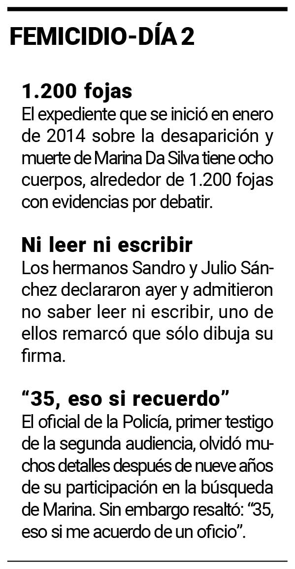 La segunda jornada de debate oral en el Tribunal Penal 2 por el femicidio en Nemesio Parma de Marina Da Silva (19) volcó testimonios en contra de Franco Jesús Ramos (28), uno de los tres acusados, pero también transitó entre nubarrones de testigos con relatos polémicos.