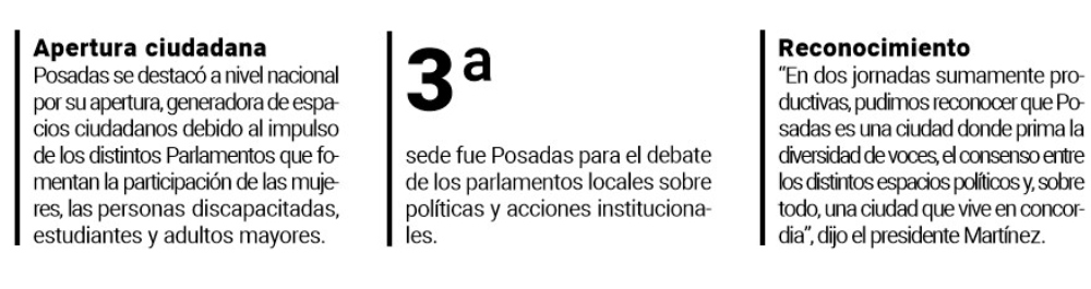 Posadas se destacó a nivel nacional por ser una ciudad con apertura, generadora de espacios ciudadanos, debido al impulso de los distintos parlamentos que fomentan la participación y representatividad de las mujeres, las personas con discapacidad, los estudiantes y los adultos mayores. Esta política, que se convirtió en una “marca registrada del Concejo Deliberante”, en materia legislativa promovió este año ordenanzas propuestas por los vecinos de la ciudad. Y, en materia política y participativa, impulsó a que más personas se involucren en los asuntos comunes de sus comunidades.