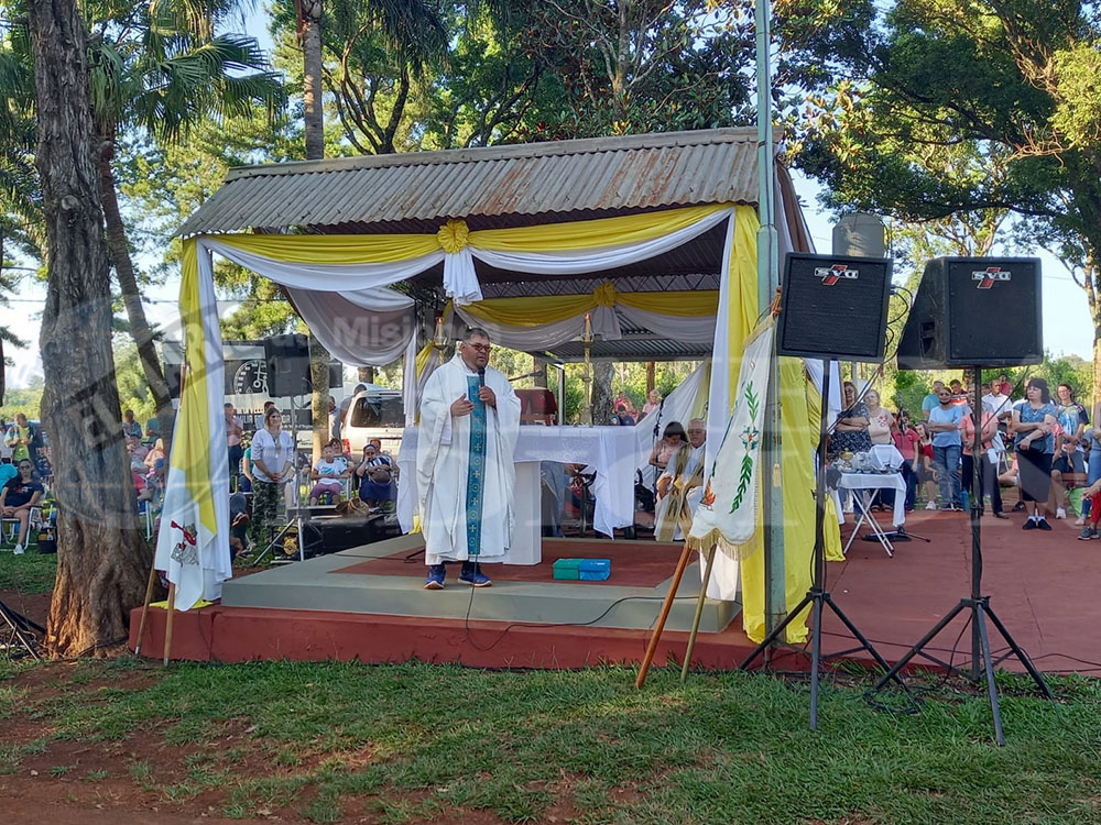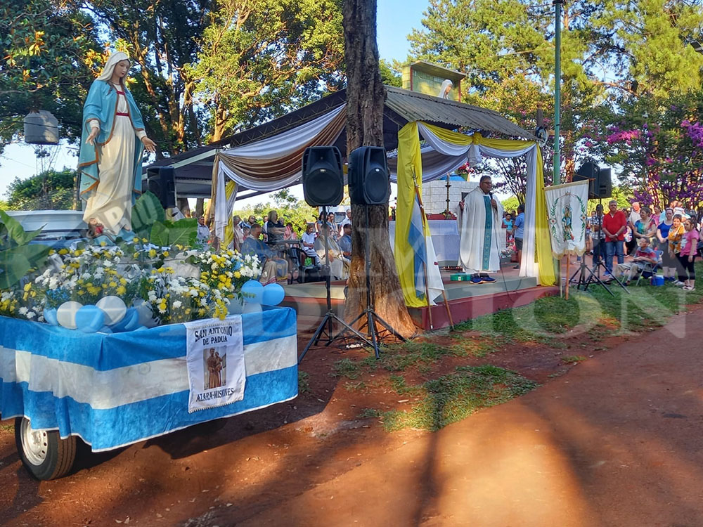La misa central se celebró a las 7.00 por el cura párroco Alejandro Cañete, luego de la procesión que salió desde la Iglesia San Pedro y San Pablo a las 4.30, como así también desde distintas comunidades de Azara, Concepción y Tres Capones colonias cercanas.