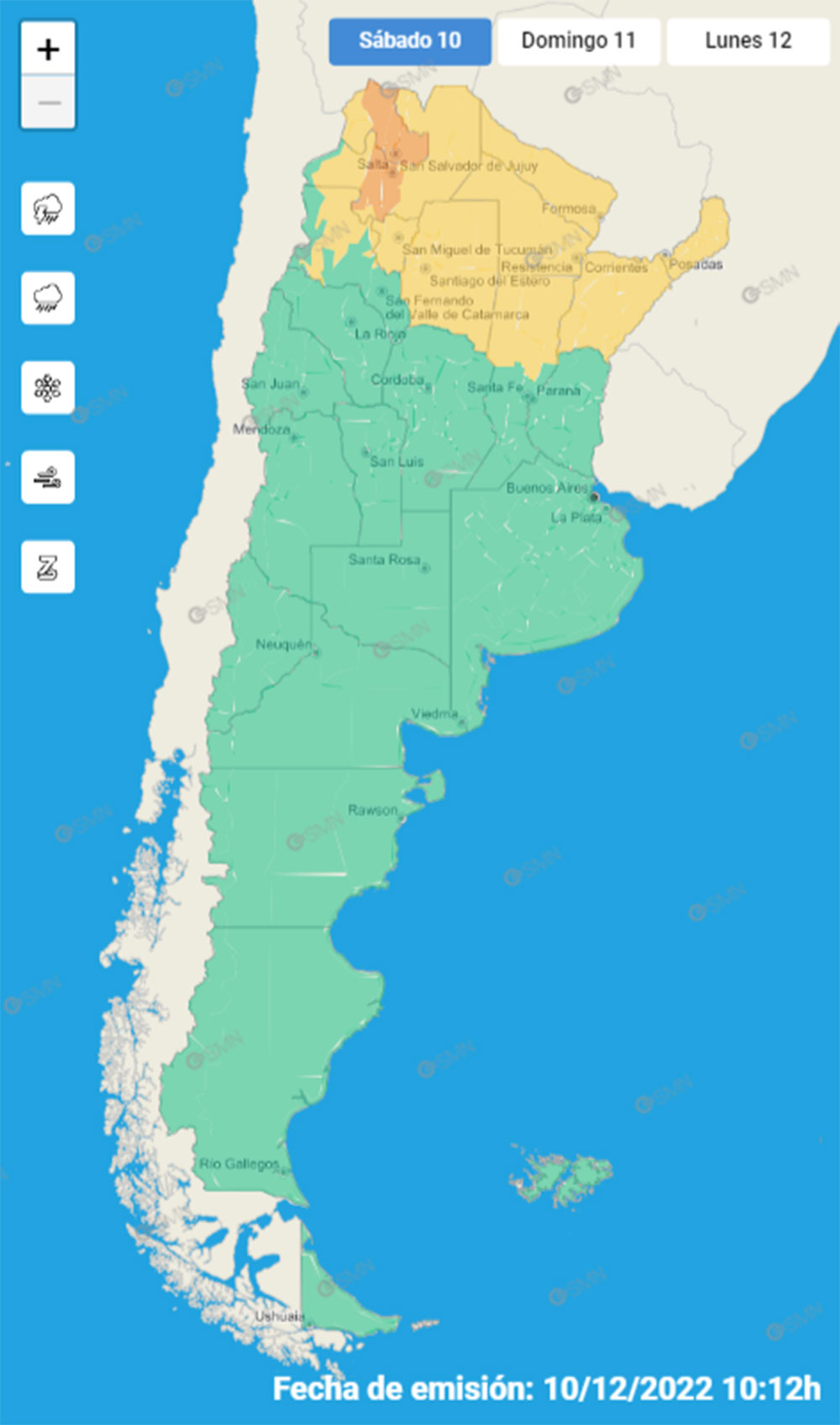 Al igual que para la provincias de Tucumán y Santiago del Estero, el norte de Córdoba, Formosa, Chaco, el norte y centro de Santa Fe, Corrientes y Misiones. El nivel de alerta amarillo implica posibles fenómenos meteorológicos con capacidad de daño y riesgo de interrupción momentánea de actividades cotidianas.