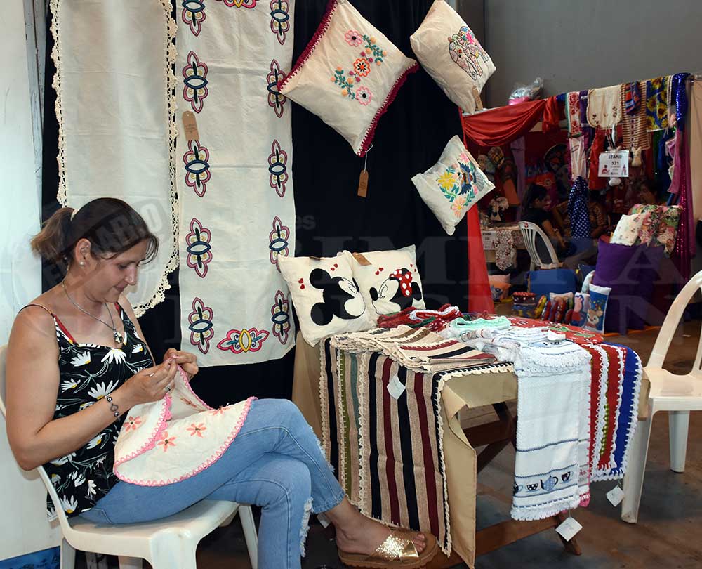 Además estuvo María Isabel Kleinubing, de MIK Exclusiva, quien hace 20 años se dedica a hacer pañuelos y chalinas, todo con teñido natural. “Uso productos naturales para hacer los teñidos, tierra, yerba, bien, bien natural, auténticamente misionero y también uso la técnica ecoprint que es estampa natural de hojas, comencé con un simple batik, mi primera técnica y después comencé a innovar con los teñidos naturales, opté por esta técnica y comencé, hice un año de laboratorio, prueba error y saqué la línea de teñidos naturales”.