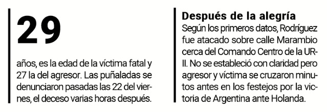Las mismas fuentes remarcaron a este Diario que los testigos de la pelea y puñaladas no fueron pocos y algunos de ellos asistieron a Rodríguez para que llegara al destacamento del Comando Centro.