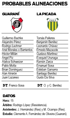 De esta manera, el equipo que saldrá a la cancha será el mismo que viene de dejar en el camino a Nacional: Tomás Palleres; Benjamín Benítez, Leonardo Chávez, Ernesto Mazacote y Gustavo Martínez; Exequiel Urunaga, Ramón Zarza, Emanuel Sosa y Esteban Gamarra; Santiago Benítez y Guido Da Silva.