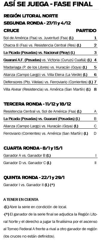 Con la mira puesta en las semifinales de la región Litoral Norte del Torneo Regional Federal Amateur, Guaraní Antonio Franco y La Picada comenzarán hoy la serie de cuartos y después de esta llave Misiones tendrá un solo representante que luchará por el ascenso al Torneo Federal A.
