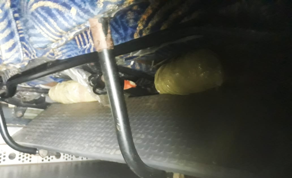 Al ascender al piso superior, observaron debajo de uno de los asientos tres paquetes envueltos en cina adhesiva, que desprendían un olor característico al de marihuana.