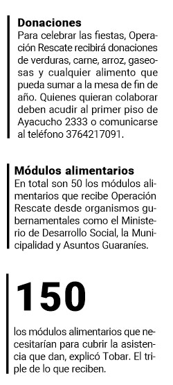 En concreto, el Ministerio de Desarrollo Social aporta 20 módulos alimentarios, la Municipalidad de Posadas brinda otros 20 módulos alimentarios y la Dirección de Asuntos guaraníes cede otros 10 módulos de comida; una partida que no está pudiendo cubrir la creciente demanda.