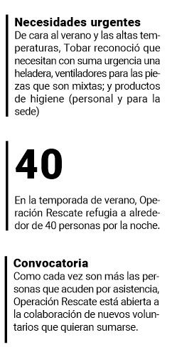 Respecto a eso, Tobar explicó que, de los 35 a 40 personas que rescatan en el verano, la mayoría pide por una ducha urgente, por lo cual son bienvenidas las donaciones de elementos de higiene personal como jabón, toallitas femeninas, shampoos, cremas de enjuague, máquinas de afeitar, toallas. Así como también productos para lavar ropa como jabón en polvo y lavandina, entre otros; y para asear la sede: líquido para limpiar los pisos y desinfectantes entre otros.