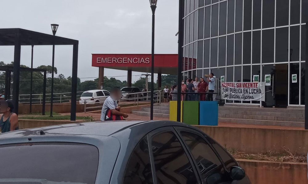 Conforme al plan de lucha fijado para hoy, en el Hospital SAMIC de San Vicente en estos momentos un grupo de trabajadores de la salud se encuentra reunido frente al establecimiento con carteles y slogans que hacen referencia al reclamo salarial vigente.