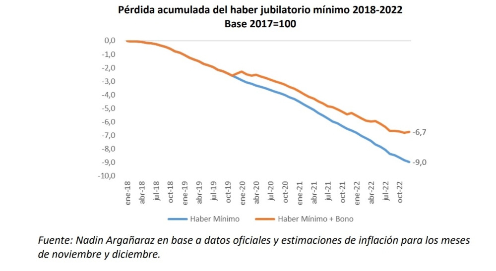 A su vez, el trabajo destaca que si la comparación se hace con el ingreso anual, la pérdida real de 2022 respecto a 2017 es del 19,3%, lo que equivale a 2,3 haberes mínimos.