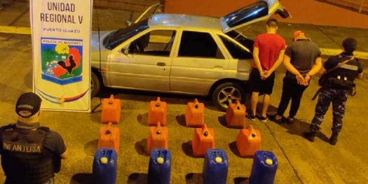 Un persecución por las calles de Puerto Iguazú finalizó con dos ciudadanos paraguayos detenidos y con el secuestro de un automóvil repleto de bidones de combustible de contrabando, 450 litros en total, que iban a ser transportados al otro lado de la frontera.