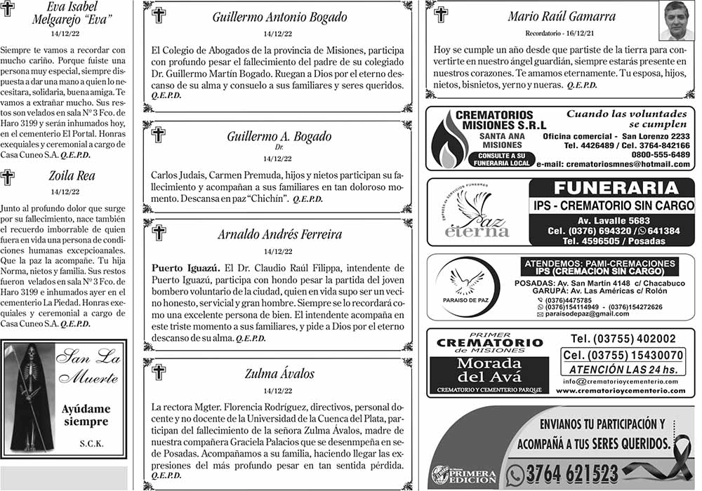 Fúnebres del Viernes 16 de Diciembre de 2022