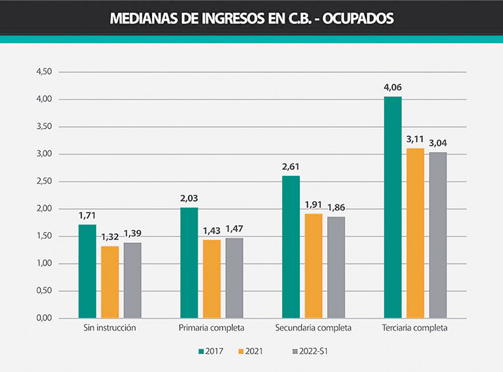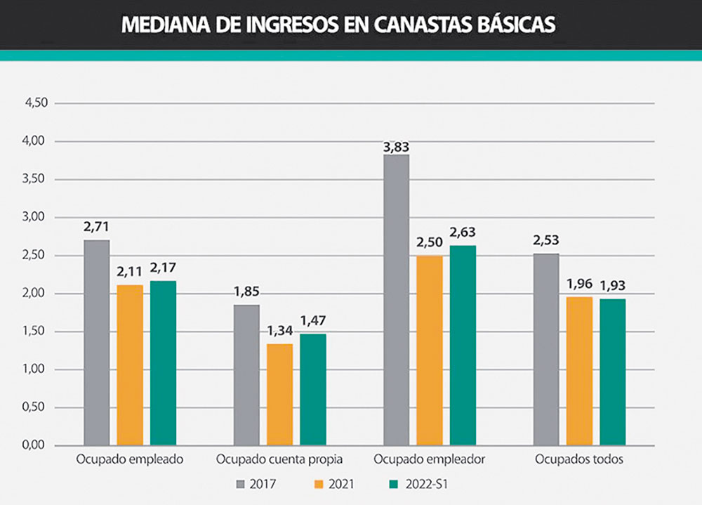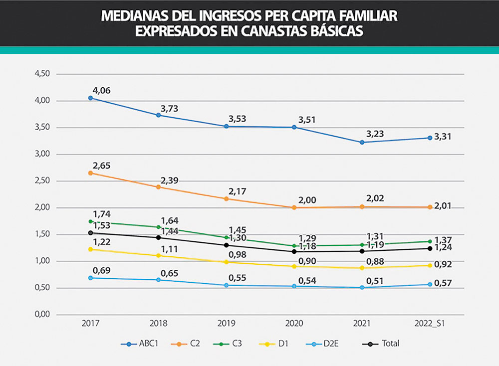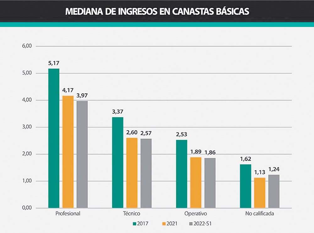 La mediana del ingreso personal en 2017 fue de 2,03 canastas básicas, bajó a 1,89 en 2018, 1,67 en 2019, 1,61 en 2020 y 1,59 el año pasado.