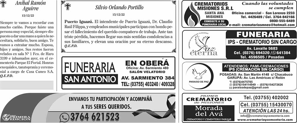 Fúnebres del Sábado 17 de Diciembre de 2022