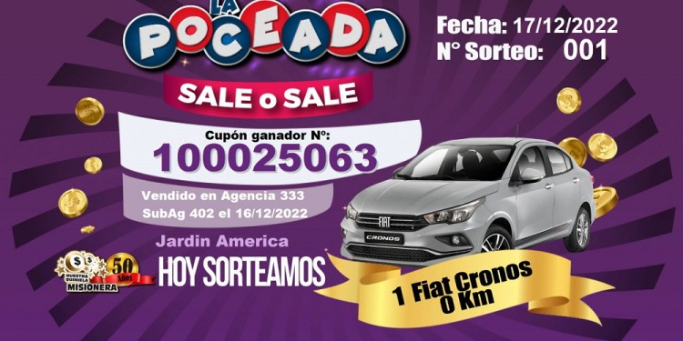El poseedor del cupón selló su apuesta en la Agencia N°333 (subagente 402) de Jardín América, y se hizo acreedor al automóvil Fiat Cronos 0 km que el Instituto Provincial de Lotería y Casinos puso en juego en ocasión del 50° aniversario de la Quiniela Misionera.