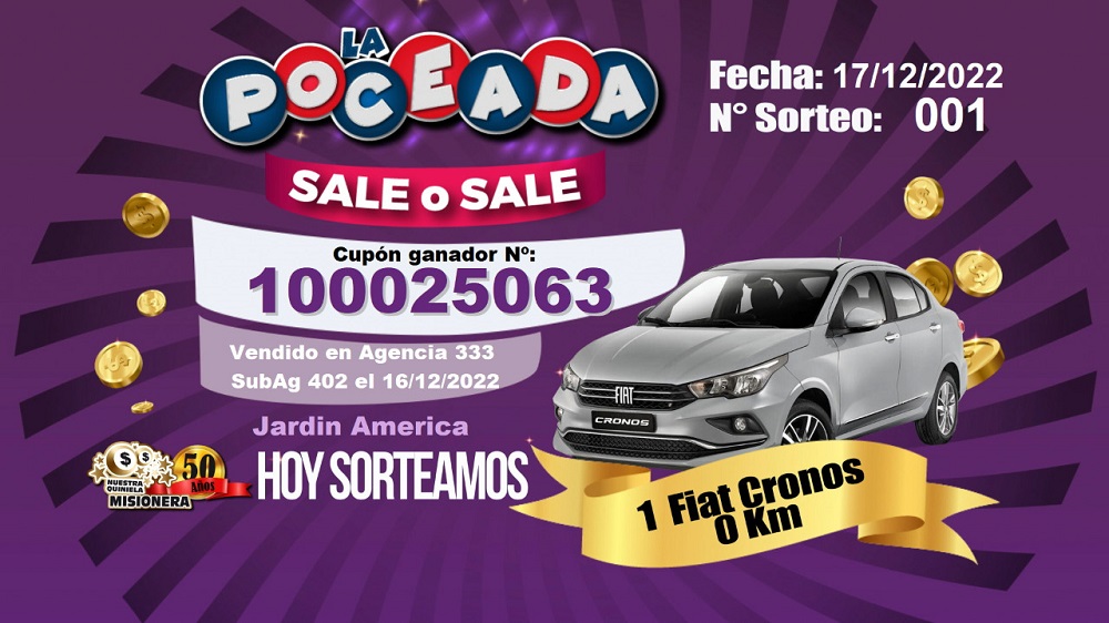 El poseedor del cupón selló su apuesta en la Agencia N°333 (subagente 402) de Jardín América, y se hizo acreedor al automóvil Fiat Cronos 0 km que el Instituto Provincial de Lotería y Casinos puso en juego en ocasión del 50° aniversario de la Quiniela Misionera.