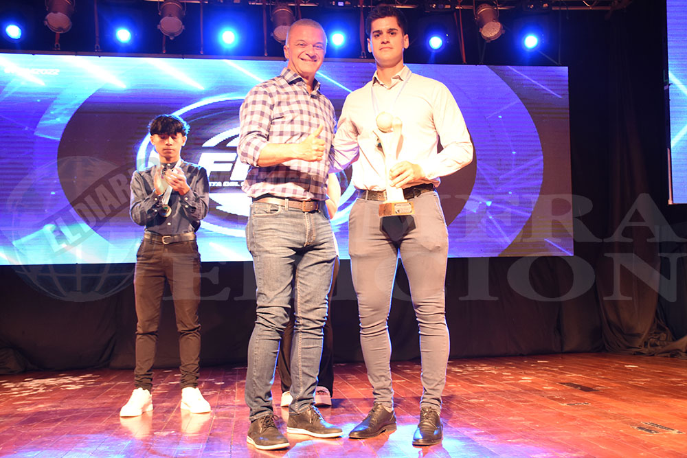 CELESTE Y BLANCO. Santiago Verón ganó en futsal. Herrera Ahuad, exjugador, entregó la estatuilla.
