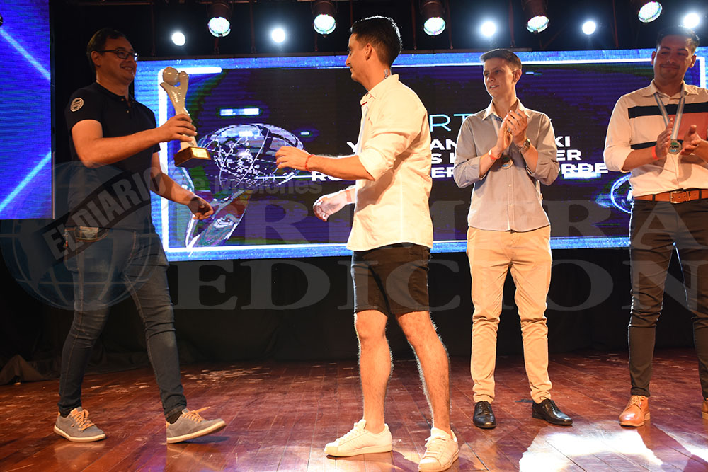 UNA CAMPEONA. Clarice Kraus ganó en rugby femenino. El maestro Luis Marinoni, director del ballet folclórico del Parque del Conocimiento, entregó la estatuilla.