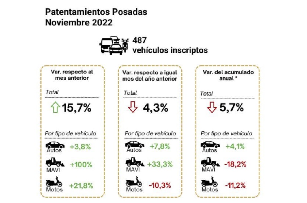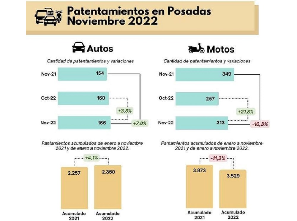 En noviembre de 2022, la cantidad patentada de autos en Posadas aumentó 3,8%, con respecto a octubre, mientras que en las demás localidades el patentamiento creció 6,2%. Por su parte, en términos interanuales, en la ciudad capital se registró un aumento de 7,8%, mientras que en las otras localidades el crecimiento fue de 13,1%.