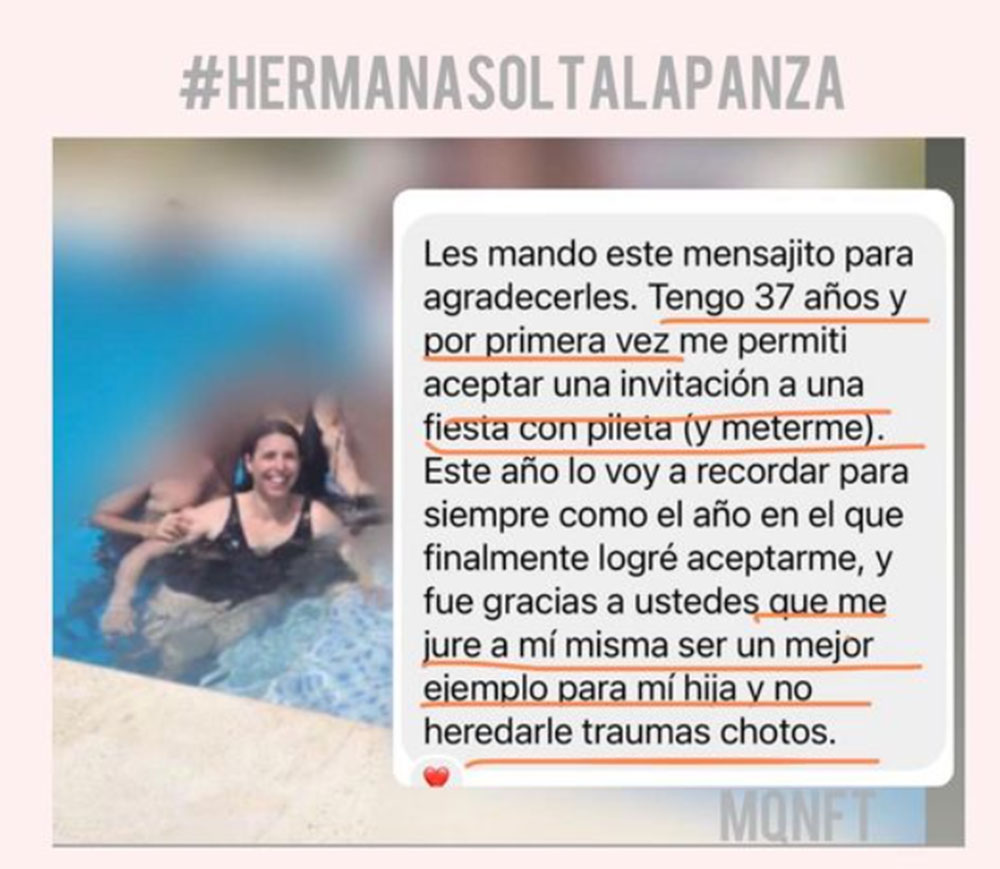 La campaña #HermanaSoltaLaPanza 2022 comenzó a mediados de noviembre con una encuesta para evaluar el impacto que tienen las dietas para adelgazar sobre nuestras vidas. Con más de 8.000 mujeres que respondieron esta encuesta en Stories, se vislumbra el peso que tienen los estereotipos de belleza y cuerpos perfectos que se imponen a las mujeres desde muy pequeñas: al 81% no le gusta como sale en las fotos y el 68% optó por no sacarse fotos en momentos importantes de su vida.