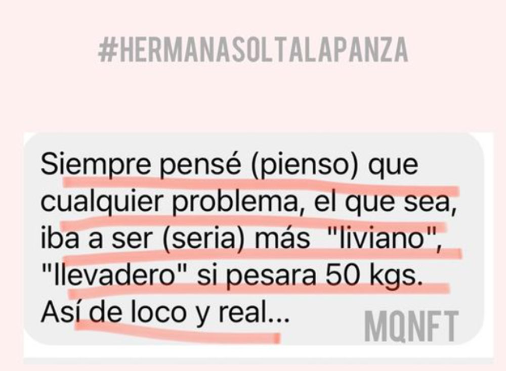 Otra mujer compartió: “Mi vieja. Ayer fui a verla… antes de entrar miré el reloj. Tardó 22 minutos en decirme algo… conté que me estaba meando porque había tomado mucho tereré de gaseosa y me dijo ‘no tomés más gaseosas, por eso tenés esa panza’. Le dije ‘te tardaste más que otras veces, 22 minutos es un récord’. Y otra recordó que “hasta me lo decía mi mamá. Me decía, mirá las revistas, no hay mujeres gordas casadas. Te vas a quedar sola… tenía diez años”.