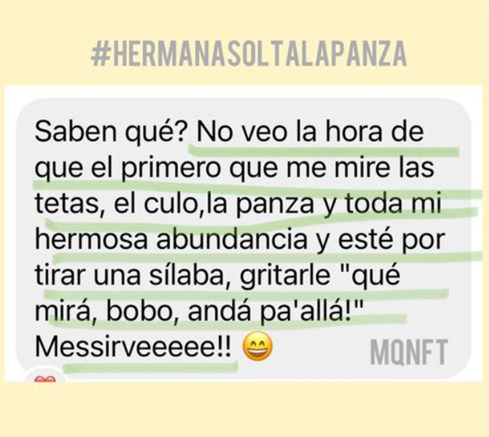 La campaña #HermanaSoltaLaPanza 2022 comenzó a mediados de noviembre con una encuesta para evaluar el impacto que tienen las dietas para adelgazar sobre nuestras vidas. Con más de 8.000 mujeres que respondieron esta encuesta en Stories, se vislumbra el peso que tienen los estereotipos de belleza y cuerpos perfectos que se imponen a las mujeres desde muy pequeñas: al 81% no le gusta como sale en las fotos y el 68% optó por no sacarse fotos en momentos importantes de su vida.