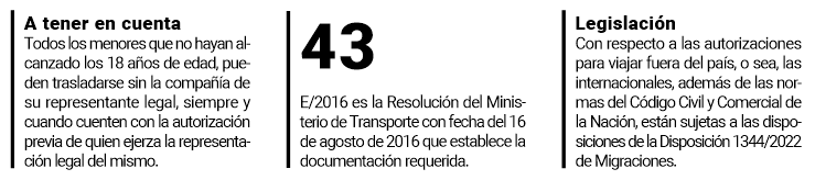 Con respecto a las primeras, las nacionales, además de las normas del Código Civil y Comercial de la Nación, están sujetas a las disposiciones de la Resolución 43 E/2016 de fecha 16 de agosto de 2016 del Ministerio de Transporte, en el cual se hace una clara distinción con relación a la documentación y requisitos necesarios, en base a la edad del menor.