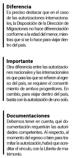 Con respecto a las autorizaciones para viajar fuera del país, o sea, las internacionales, además de las normas del Código Civil y Comercial de la Nación, están sujetas a las disposiciones de la Disposición 1344/2022 de la Dirección Nacional de Migraciones de fecha 6 de julio de 2022.