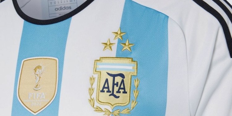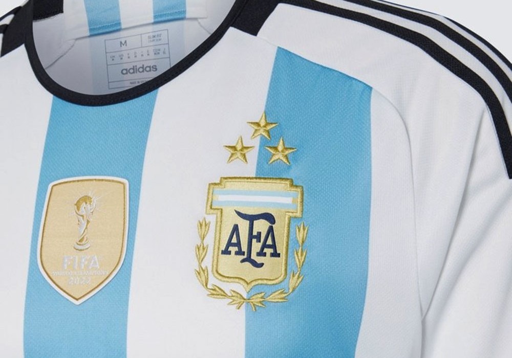 La nueva camiseta tiene las tres estrellas bordadas en forma piramidal sobre el escudo de la Asociación del Fútbol Argentino (AFA) y, en el centro del pecho, lleva el parche con la Copa del Mundo y la leyenda “FIFA World Champions”.