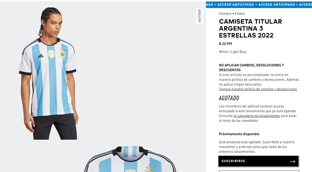 El modelo celeste y blanco a rayas, idéntico al utilizado en la final de la Copa del Mundo ante Francia, se ofreció de forma online, pero a las pocas horas del lanzamiento, Adidas anunció: “Agotado. Los miembros de AdiClub tuvieron acceso exclusivo a este lanzamiento. Próximamente disponible”, sin precisar las fechas en las que será puesta a disposición tanto en la web como en los locales comerciales.